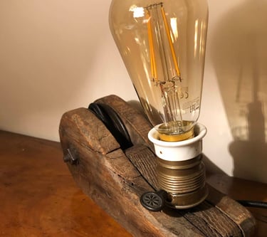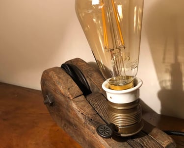 Les luminaires. Tous sont des pièces uniques, soit par l'objet qui est à l'origine, soit par la pièce de bois que j'utilise ; ils répondent aux normes européennes en vigueur. Ils trouveront toute leur place dans votre décoration intérieure quel que soit votre style : campagne, industriel, scandinave, japandi, moderne, rustique.