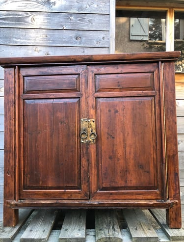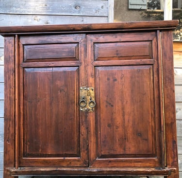 Restauration d'un petit bahut : reprise charnière et réfection porte gauche, nettoyage